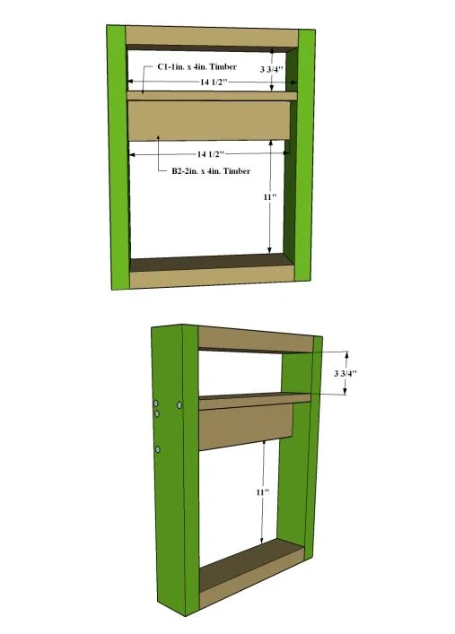 Now we measure and mark 3 3/4'' from the top piece B1 down. We glue the C1 piece horizontally just below the marked place and screw it from the outside. If you wish, you can also screw in using a krag jig by opening pocket holes as in the previous process.