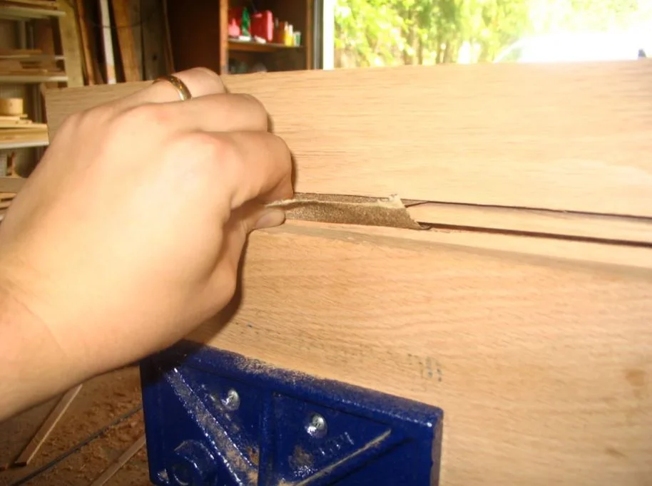 With the guide in place take your largest chisel and, starting at one end of the board, remove the waste inside the groove. Use the guide to keep the desired angle.