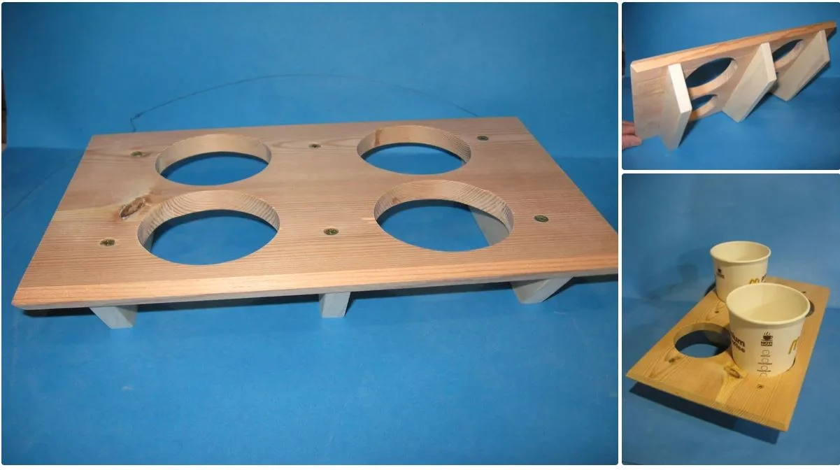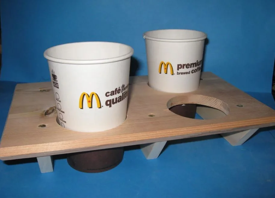 The dimensions will actually depend on the size of the cup used and the number you want to carry. You could also use a piece of plywood instead of spruce . . . I just happened to have the spruce available.